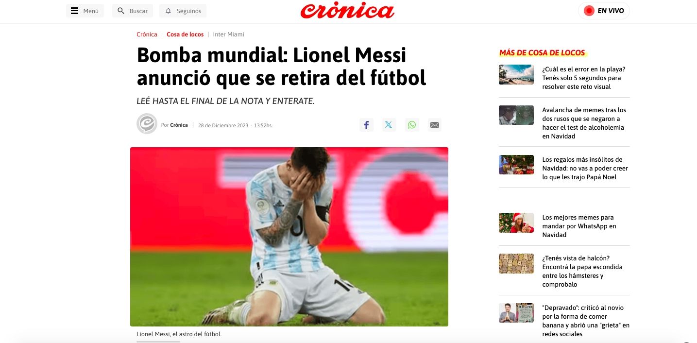 El que no anduvo con pequeñeces fue el diario Crónica, que el 28 de diciembre de 2023 anunció lo que nadie quiere oír. “Bomba mundial: Lionel Messi anunció que se retira del fútbol”, tituló, antes de brindarles tranquilidad a sus lectores y escribir, más tarde: “FELIZ DÍA DE LOS INOCENTES!!!!!! ¡Tenemos Leo para rato!”.