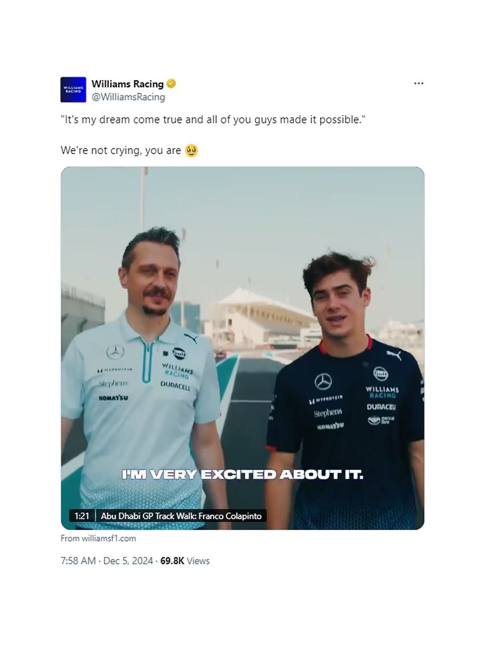 El video lo compartió la cuenta oficial de Williams en sus redes sociales, destacando una frase en particular de Franco: “Es mi sueño hecho realidad y todos ustedes lo hicieron posible”. Desde el perfil de la escudería no ocultaron su emoción por este agradecimiento: “No estamos llorando, tú estás”.
