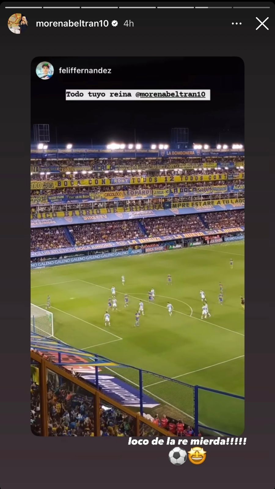 La mujer de ESPN, que tiempo atrás se declaró hincha del mismo equipo en donde juega su novio, primero compartió en Instagram el posteo de un seguidor que mostraba uno de los tuits de Boca, con Blondel festejando y la frase "Perreo pa' los nenes, perreo pa' las nenas", una parte de la canción de Héctor & Tito que se llama Baila Morena, a lo que Beltrán agregó: "Temón".