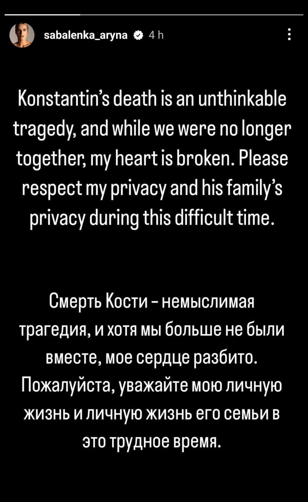 “La muerte de Konstantin es una tragedia inimaginable y, aunque no estábamos más juntos, mi corazón está roto. Por favor respeten mi privacidad y la de su familia en este momento tan difícil”, fue el mensaje que publicó Sabalenka, este miércoles por intermedio de las historias en esa red social.