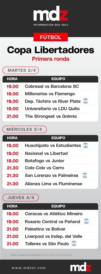 Luego, ya el jueves 4 de abril, Rosario Central se medirá con Peñarol en el Gigante de Arroyito a las 19:00. Será por el grupo G. Por último, el mismo jueves, Talleres jugará contra San Pablo en el Estadio Mario Alberto Kempes a las 21:00, por el grupo B.