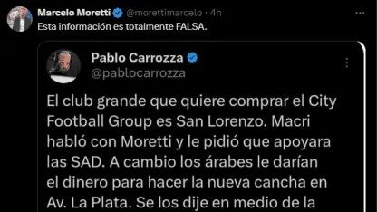 Sin embargo, horas después de esta afirmación fue el propio titular del club de Boedo el que salió a desmentirlo en las redes sociales. Lo hizo citando el tuit del periodista y le agregó la frase: "Esta información es totalmente FALSA". El City Group es dueño de varios equipos y tiene tres equipos en Sudamérica: Montevideo City Torque de Uruguay, Bolívar y EC Bahía de Brasil.