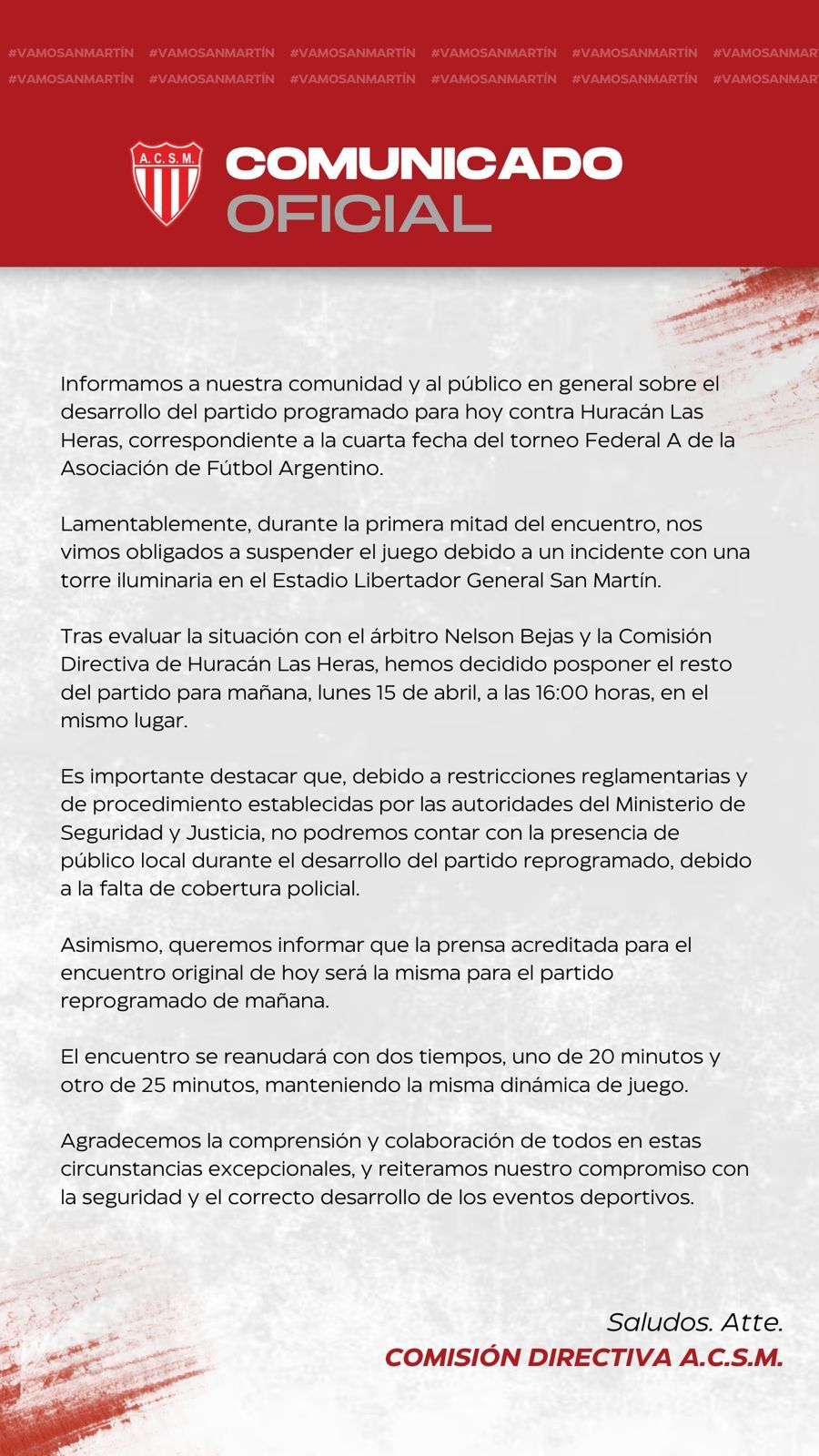 Lo que era una verdadera fiesta terminó suspendido por fuerza mayor. No fue ni la violencia, ni los hinchas, esta vez, una falla eléctrica en una de las torres de iluminación tuvo un desperfecto del estadio del Atético Club San Martín obligó a parar el duelo entre mendocinos que disputaban el Chacarero y Huracán Las Heras por la cuarta fecha del Torneo Federal A.