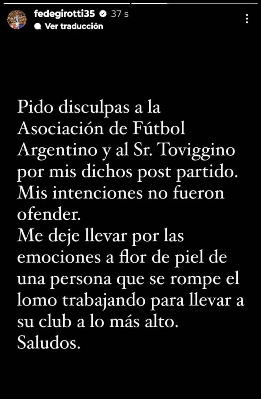 En las historias de su cuenta de Instagram Girotti realizó su descargo: "Pido disculpas a la Asociación del Fútbol Argentino y al Sr. Toviggino por mis dichos post partido. Mis intenciones no fueron ofender. Me dejé llevar por las emociones a flor de piel de una persona que se rompe el lomo trabajando para llevar a su club a lo más alto. Saludos.