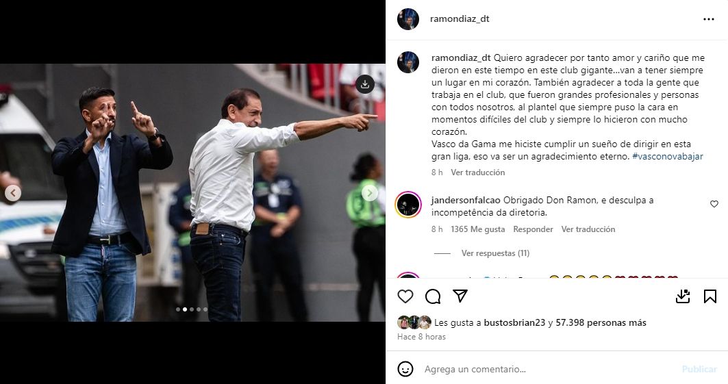 "Al plantel que siempre puso la cara en momentos difíciles del club y siempre lo hicieron con mucho corazón. Vasco da Gama me hiciste cumplir un sueño de dirigir en esta gran liga, eso va ser un agradecimiento eterno", sentenció Ramón Díaz en su cuenta de Instagram.