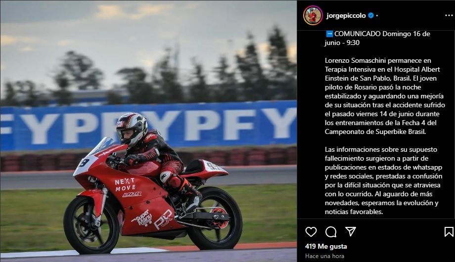 Fue el periodista Jorge Píccolo que, en Instagram, brindó detalles al respecto y también habló sobre las informaciones que dieron por fallecido al piloto rosarino: "Lorenzo permanece en Terapia Intensiva en el Hospital Albert Einstein de San Pablo. Pasó la noche estabilizado y aguardando una mejoría de su situación tras el accidente sufrido el pasado viernes 14 de junio durante los entrenamientos de la Fecha 4 del Campeonato de Superbike Brasil".