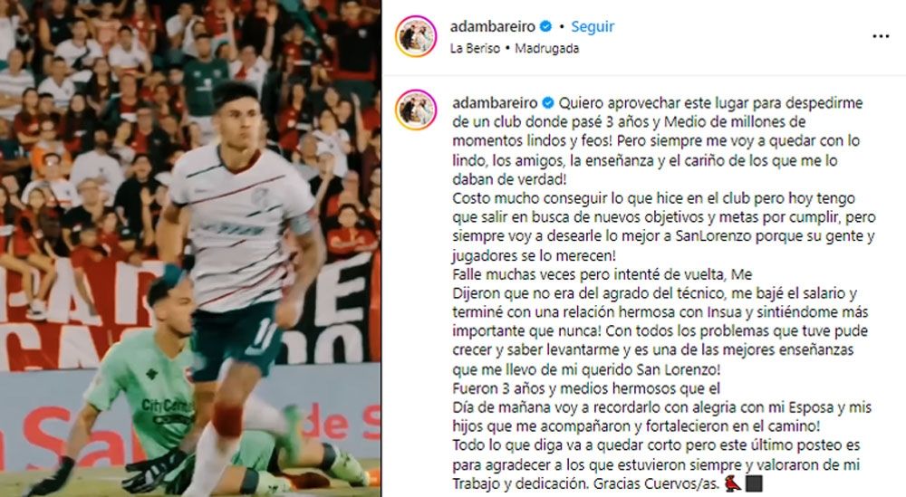 Lo anunció tanto el Ciclón como River en sus cuentas oficiales. Luego, lo confirmó el propio Bareiro, que publicó un sentido mensaje de despedida a su exclub, específicamente a los hinchas, donde hizo un repaso de su paso por el equipo de Boedo y hasta dejó confesiones particulares. Todo, adjuntando un video de algunas jugadas con esa camiseta.