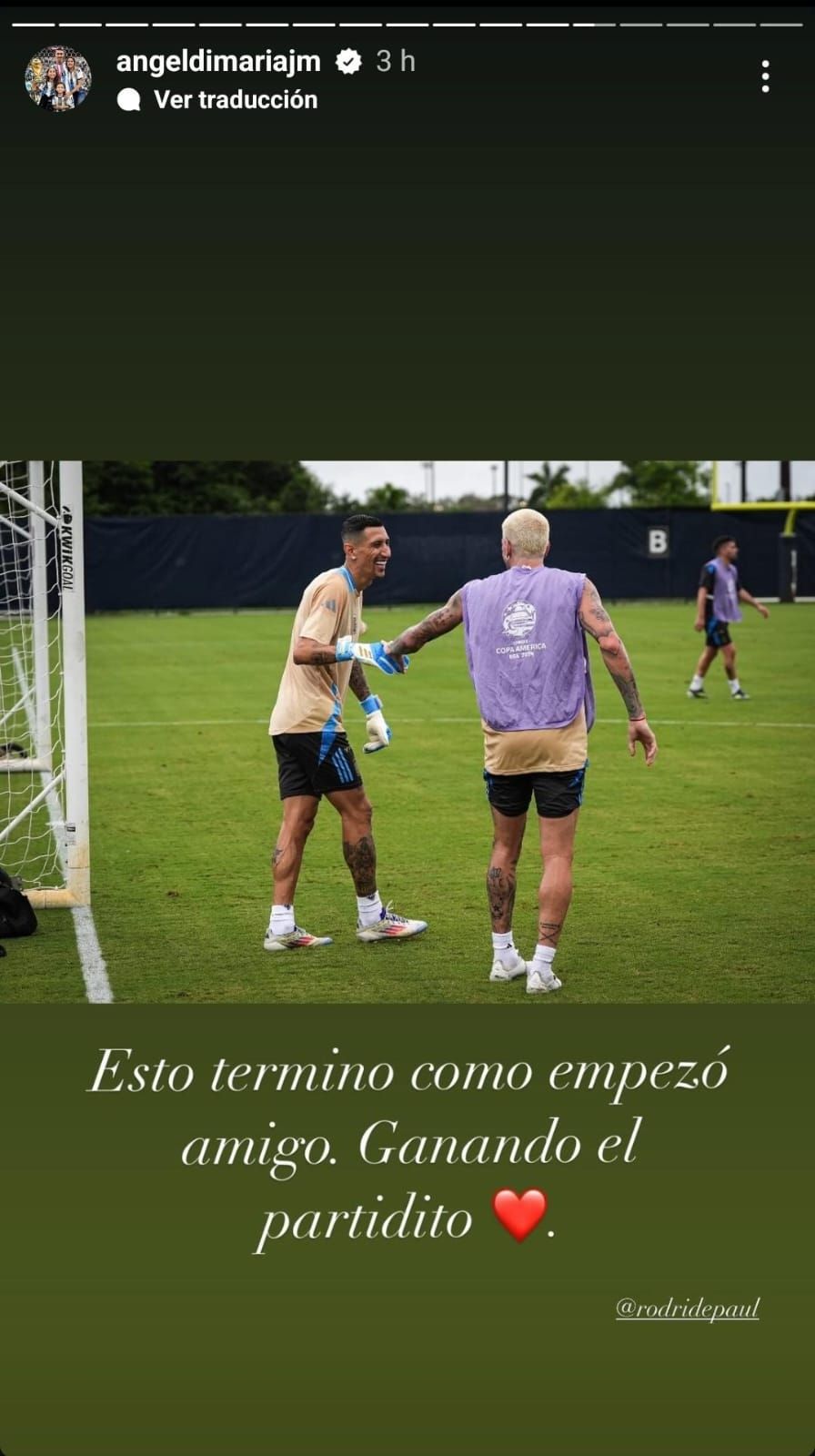 Di María usó las historias de Instagram para subir una historia junto a Lionel Messi en la que escribió: "La vida me dio más de lo que alguna vez le pude pedir". También otra con Rodrigo De Paul en la que señaló: "Esto terminó como empezó amigo, ganando el partidito".