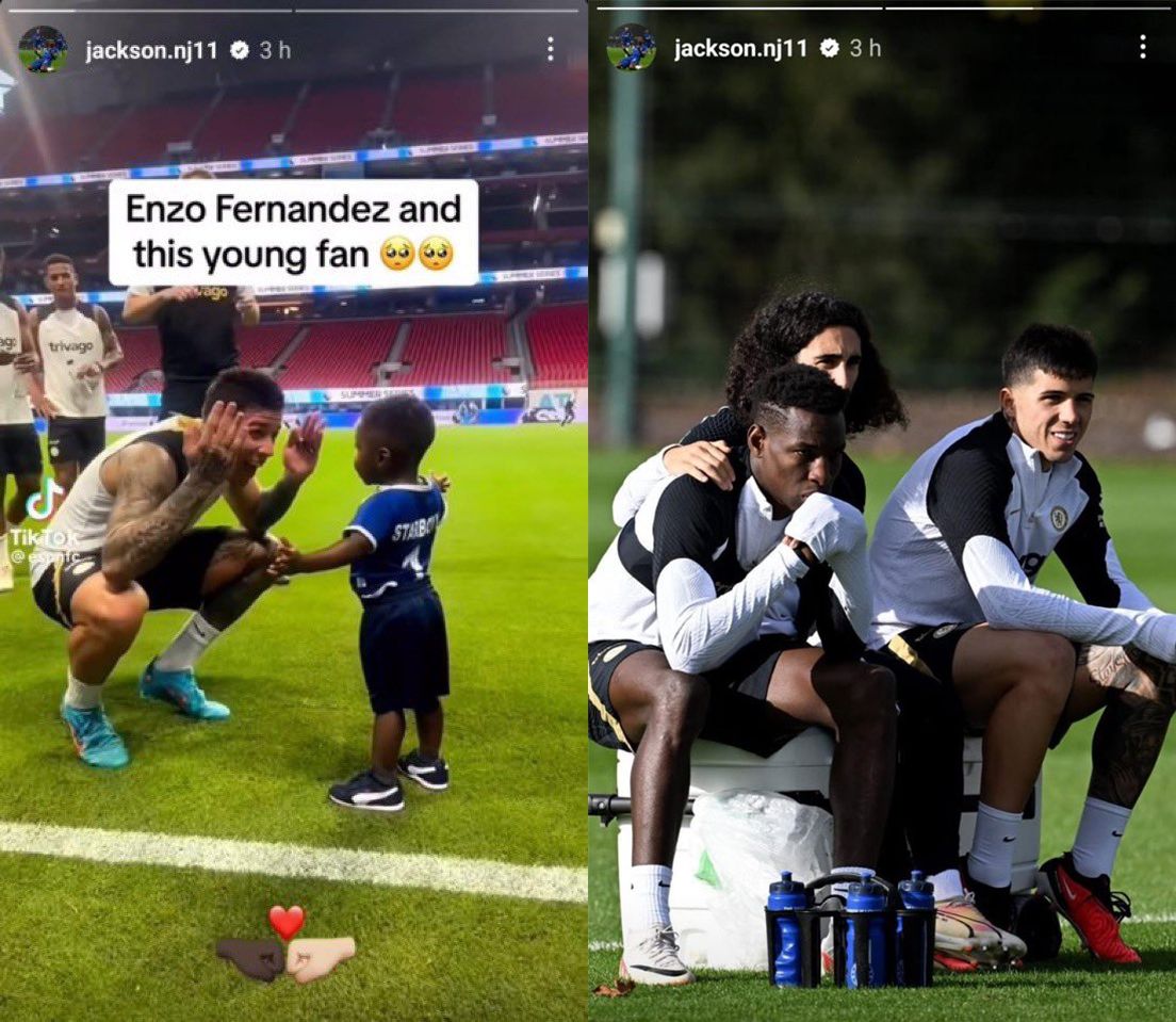 La primera de ellas es un video del 2023, que se había viralizado en su momento, en el que se lo ve al argentino jugando muy alegre con un pequeño hincha del Chelsea afrodescendiente, a la que le agregó la leyenda "Enzo Fernández y este pequeño fan" con emojis de emoción. La otra historia es una foto en la que se los ve a Jackson y a Fernández juntos durante un entrenamiento con el club. A pesar de todo, Enzo no está solo.
