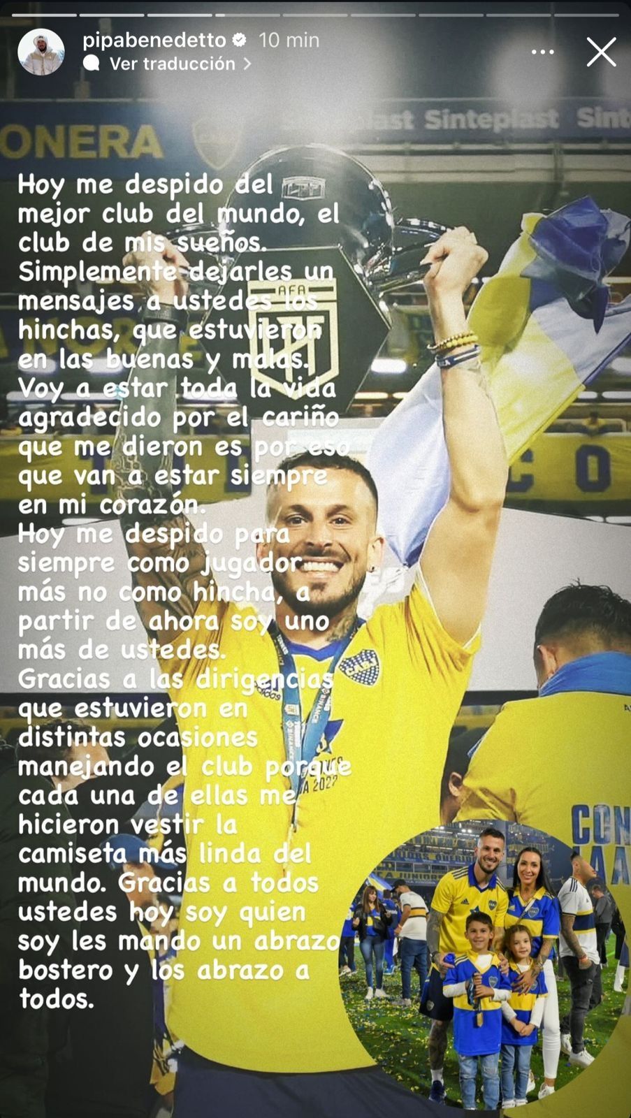 Benedetto aprovechó también la ocasión para utilizar sus redes sociales con un sentido mensaje de despedida que tuvo como destinatarios a los simpatizantes de la institución. "Hoy me despido del mejor club del mundo, el club de mis sueños. Simplemente dejarles un mensaje a ustedes los hinchas, que estuvieron en las buenas y malas. Voy a estar toda la vida agradecido por el cariño que me dieron. Es por eso que van a estar siempre en mi corazón. Hoy me despido para siempre como jugador, más no como hincha, a partir de ahora soy uno más de ustedes", confesó.