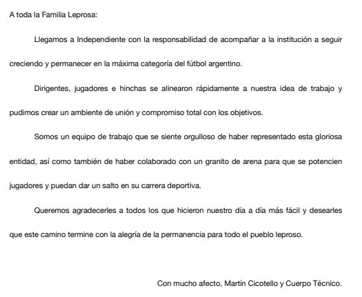 Para comenzar con su escrito, el hombre de 43 años expresó: "A toda la Familia Leprosa: llegamos a Independiente con la responsabilidad de acompañar a la institución a seguir creciendo y permanecer en la máxima categoría del fútbol argentino".