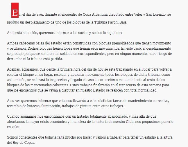 "En el día de ayer, durante el encuentro de Copa Argentina disputado entre Vélez y San Lorenzo, se produjo un desplazamiento de uno de los bloques de la Tribuna Pavoni Baja. Ante esta situación, queremos informar a las socias y socios lo siguiente: