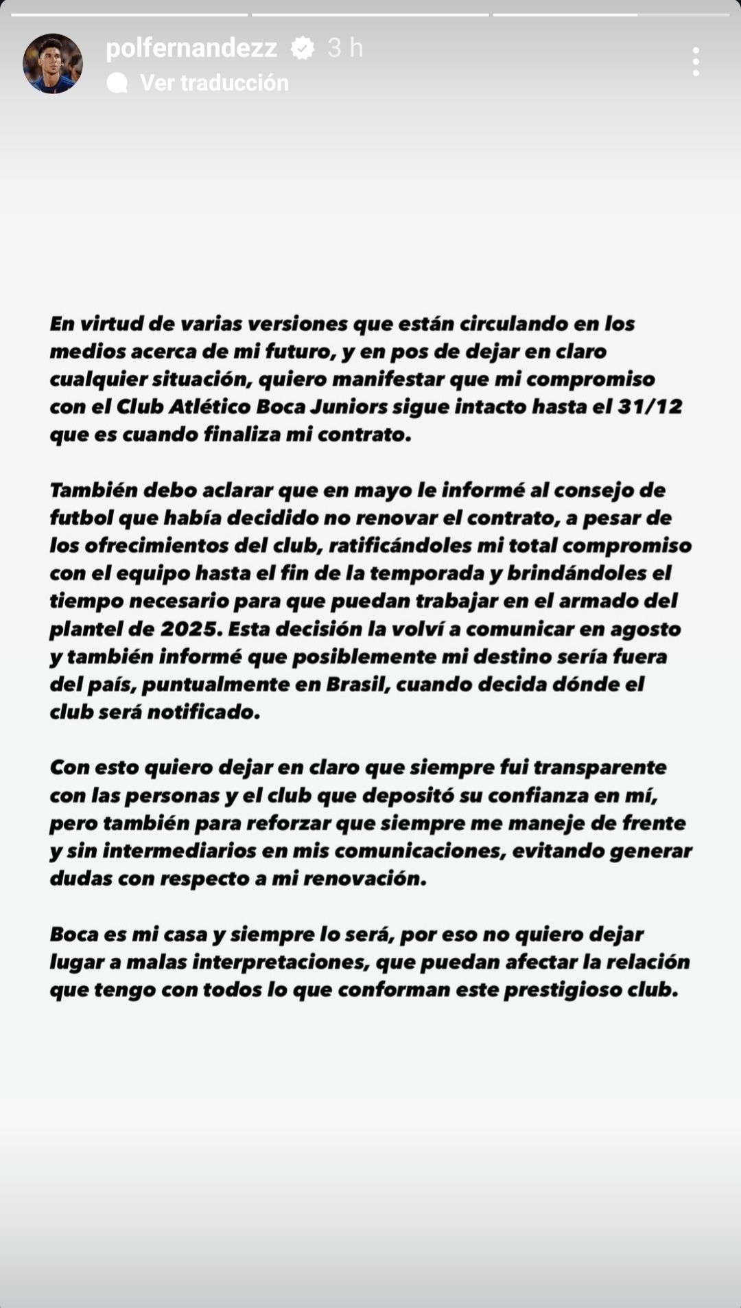 El particular posteo con el que Guillermo "Pol" Fernández confirmó que no renovará su contrato después de diciembre con Boca, generó un sinfín de especulaciones en torno a la decisión que podía llegar a tomar Juan Román Riquelme y el Consejo de Fútbol con respecto al volante.