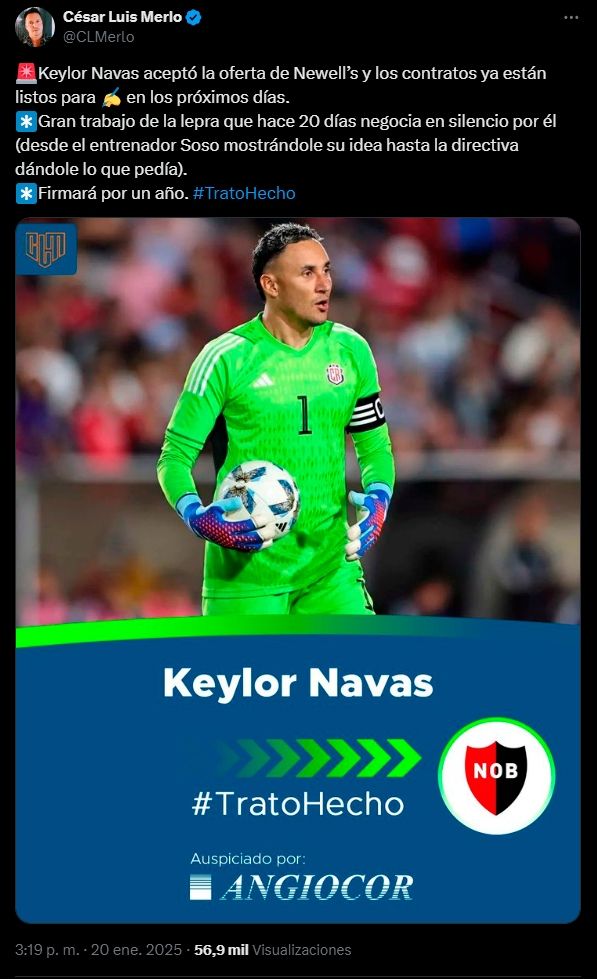 Este mercado de pases de verano 2025 en Argentina está siendo uno de los mejores que se recuerden en mucho tiempo. River y Boca se vienen llevando casi todas las miradas, con las llegadas de varios campeones del mundo y de América en Núñez, como Gonzalo Montiel y Lucas Martínez Quarta, o de nombres destacados de Europa en la Ribera, como el español Ander Herrera. Pero hay otros clubes que también han sabido dar la nota, como Newell's Old Boys, que traerá nada menos que a Keylor Navas.