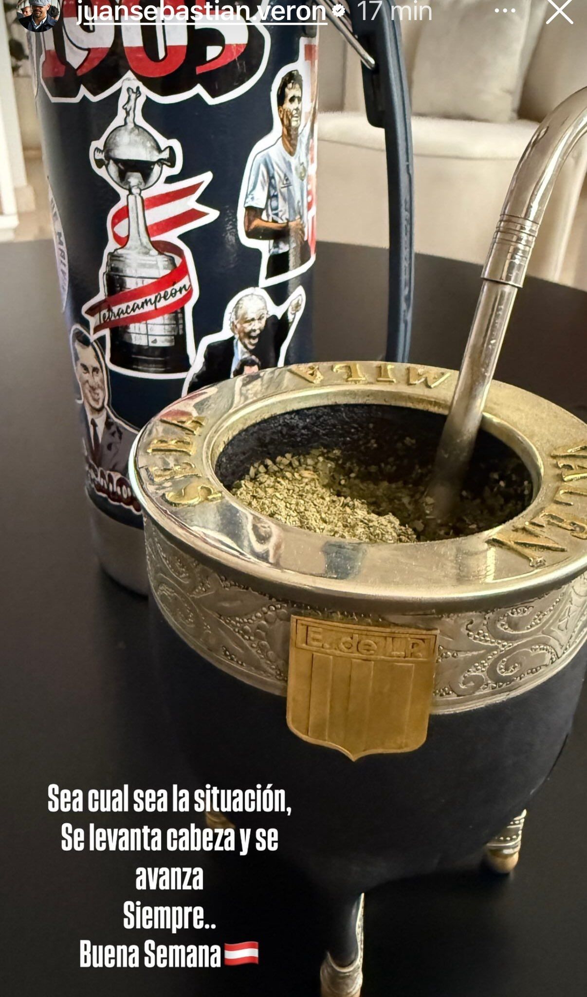 La relación entre Estudiantes de La Plata y Foster Gillett sigue envuelta en incertidumbre. Luego de que se frustraran los pases de Rodrigo Villagra (de River a un destino nunca definido) y Valentín Gómez (de Vélez a Udinese), y mientras se demora el desembolso del dinero en Estudiantes por la compra de Ezequiel Piovi, que tuvo que afrontar el Pincha, su presidente, Juan Sebastián Verón, hizo un sugerente posteo en Instagram que alimentó los rumores. "Sea cual sea la situación, se levanta cabeza y se avanza siempre", escribió junto a una foto con un mate del Pincha.