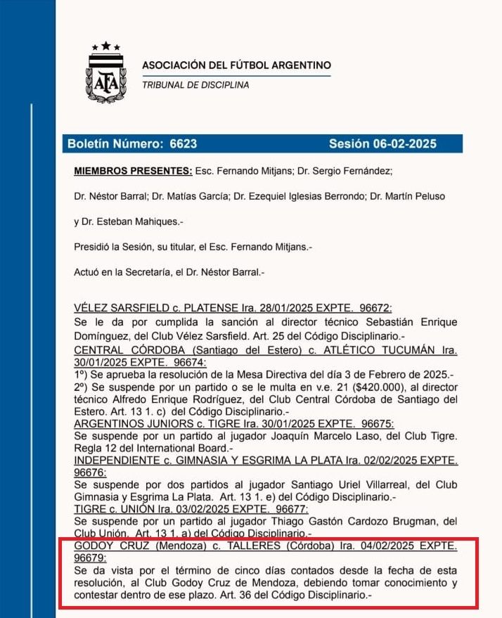 “Se da vista por el término de cinco días contados desde la fecha de esta resolución, al club Godoy Cruz de Mendoza, debiendo tomar conocimiento y contestar dentro de ese plazo”, detallaron.