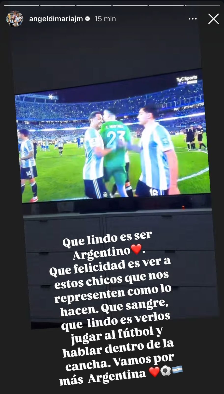 El Fideo, por su parte, eligió un tono más confrontativo que Messi. También en sus historias, subió una foto de su televisión con la siguiente leyenda: "Qué lindo es ser argentino. Qué felicidad es ver a estos chicos que nos representen como lo hacen. Qué sangre qué lindo es verlos jugar al fútbol y hablar dentro de la cancha. Vamos por más, Argentina".