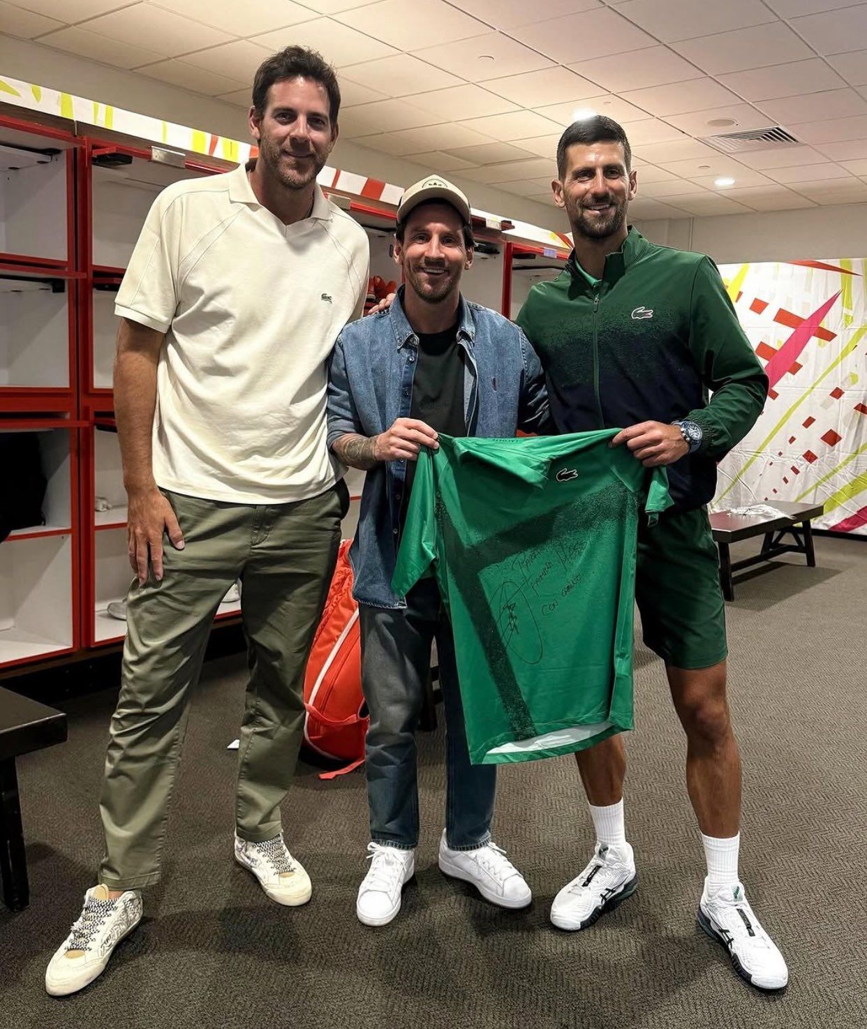 Messi, quien sigue recuperándose de la distensión que lo marginó de la última doble fecha de Eliminatorias con Argentina, aprovechó su tiempo libre para disfrutar del tenis junto a Antonela Roccuzzo. Y no fue el único crack presente: Del Potro también asistió y, tras el partido, compartieron una foto en el vestuario con Djokovic, un momento que rápidamente se volvió viral.
