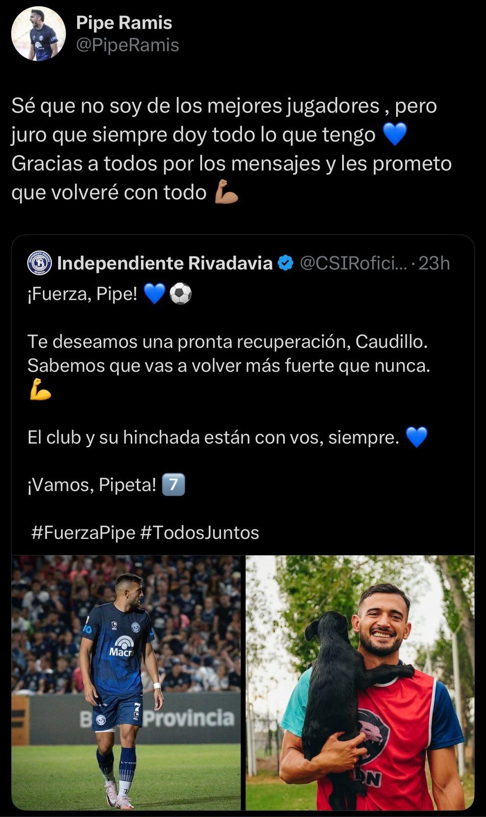 El cordobés utilizó su perfil de X (ex Twitter) para expresar unas emotivas palabras y llevar tranquilidad a su entorno. El atacante citó la publicación de la cuenta de la Lepra anteriormente y afirmó: "Sé que no soy de los mejores jugadores, pero juro que siempre doy todo lo que tengo Gracias a todos por los mensajes y les prometo que volveré con todo”.