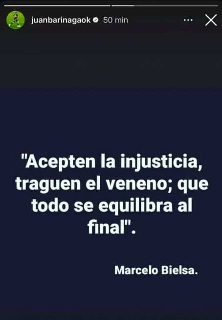 “Acepten la injusticia, traguen el veneno, que todo se equilibra al final. Marcelo Bielsa.”, escribió en su historia Barinaga, aunque al ver las repercusiones de la foto decidió eliminar el posteo. El lateral derecho jugó por última vez en la derrota de Boca ante Alianza Lima por 1-0 en Perú, el 18 de febrero último, que derivó en la eliminación en el Repechaje de la Copa Libertadores.