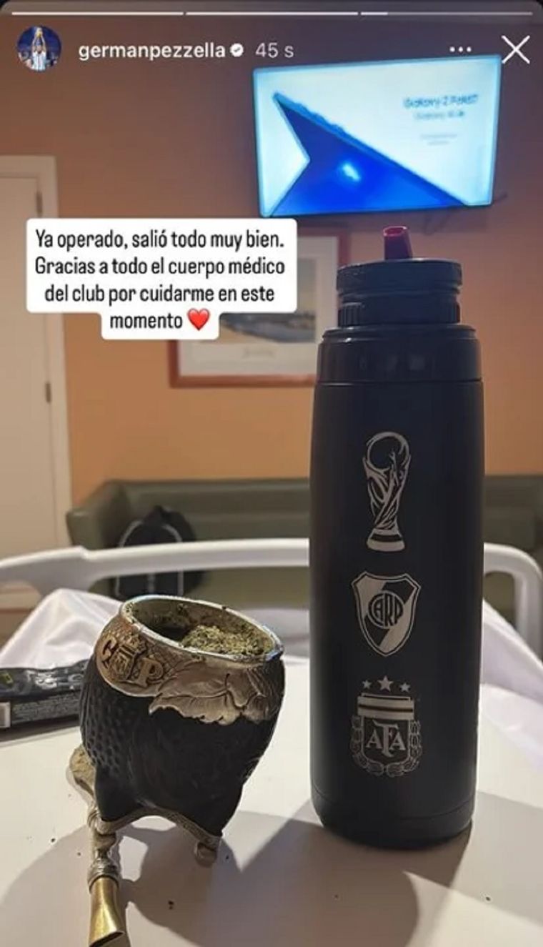 A través de una historia desde su cuenta oficial de Instagram, Pezzella escribió: “Ya operado, salió todo muy bien. Gracias a todo el cuerpo médico del club por cuidarme en este momento”, acompañado de una imagen con un mate y un termo con el escudo de River, de la “Albiceleste” y el trofeo del Mundial.