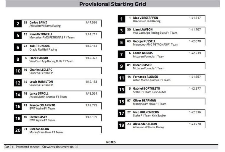 A pesar de la sanción, la FIA permitió que Ocon largue la carrera, pero desde la última posición, manteniéndose así los 20 pilotos en la parrilla. Esto benefició a Pierre Gasly, que avanzó al 18°, y a Alex Albon, que subió al 19°. Franco Colapinto, en cambio, mantiene su posición original en la parrilla: 16°.