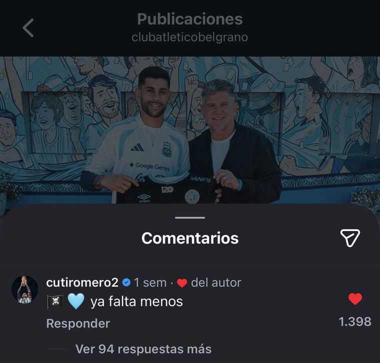 Si faltaba algo más para alimentar las ilusiones de los hinchas, se viralizó un comentario que había hecho una semana atrás el Cuti en una publicación de Luifa Artime (presidente del cuadro cordobés) en la que se los ve a ambos con la camiseta del club. "Ya falta menos", escribió el central de la Scaloneta, junto con emojis de una bandera pirata y un corazón celeste.