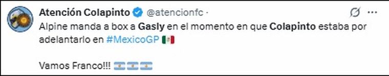 X @Colapinto_infoEl final de la carrera en Austin, Estados Unidos, fue tema de conversación entre los fanáticos de la Fórmula 1 durante la semana. Alpine le dio una orden clara a Franco Colapinto: mantener posiciones (" hold psitions") con su compañero, Pierre Gasly. Sin embargo, el argentino ignoró el pedido y lo pasó a poco de la bandera a cuadros.