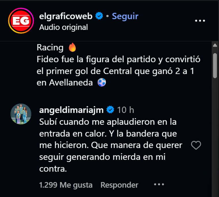 El portal en cuestión es El Gráfico, que compartió el video de los chiflidos en su cuenta de Instagram con la siguiente leyenda: "Di María, reemplazado en el segundo tiempo, se fue silbado por los hinchas de Racing. Fideo fue la figura del partido y convirtió el primer gol de Central, que ganó 2 a 1 en Avellaneda".