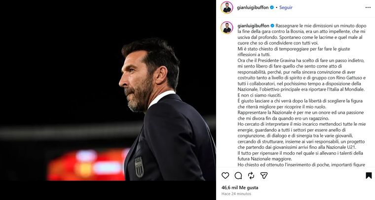 "Renunciar un minuto después de finalizar el partido contra Bosnia fue un acto urgente, que surgió de lo más profundo de mi ser. Tan espontáneo como las lágrimas y el dolor que siento, que sé que comparto con todos ustedes. Me pidieron que esperara hasta que todos tuvieran tiempo para reflexionar. Ahora que el presidente Gravina ha decidido dar un paso al costado, me siento libre para hacer lo que considero un acto responsable. Porque, a pesar de mi sincera convicción de que hemos construido mucho en términos de espíritu de equipo, junto con Rino Gattuso y todos nuestros colaboradores, en el poco tiempo disponible para la selección nacional, el objetivo principal era llevar a Italia de vuelta al Mundial. Y fracasamos", escribió el legendario ex arquero en su cuenta de Instagram.
