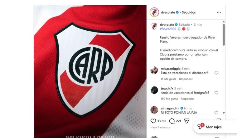 El estreno de esta modalidad se dio con Fausto Vera. “Fausto Vera es nuevo jugador de River Plate. El mediocampista selló su vínculo con el Club a préstamo por un año, con opción de compra”, fue el texto que publicó la institución, acompañado solo por el escudo, lo que generó revuelo inmediato en redes por la sobriedad del anuncio.