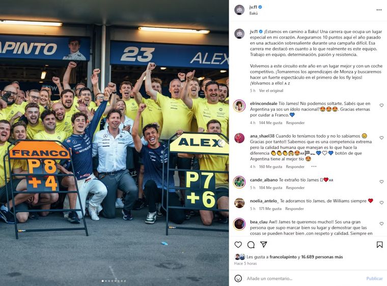 “¡Estamos en camino a Bakú! Una carrera que ocupa un lugar especial en mi corazón. Aseguramos 10 puntos aquí el año pasado en una actuación sobresaliente durante una campaña difícil. Esa carrera me destacó en cuanto a lo que realmente es este equipo. Trabajo en equipo, determinación, pasión y resistencia“, escribió Vowles.