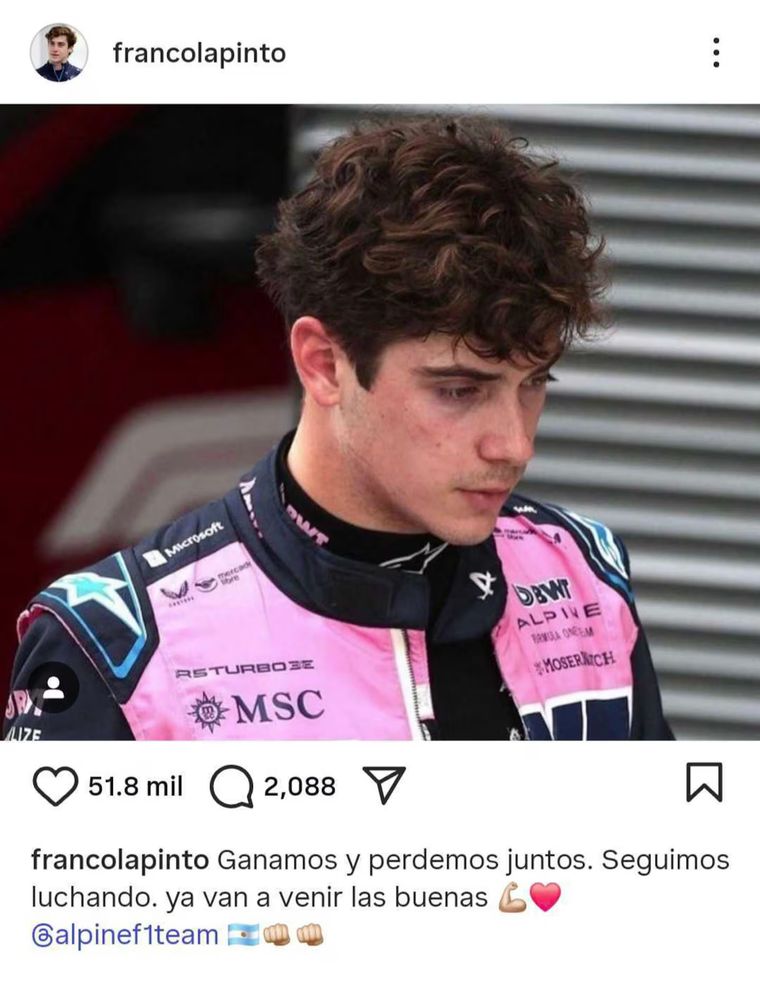Ante el aluvión de críticas, el joven decidió expresarse en sus redes sociales con un mensaje directo y conciliador. "Ganamos y perdemos juntos. Seguimos luchando. Ya van a venir las buenas", escribió Colapinto en su cuenta de Instagram, en clara señal de respaldo al equipo pese al mal momento. Una frase que apunta a bajar la tensión después de una carrera que dejó mucho enojo entre los fanáticos.