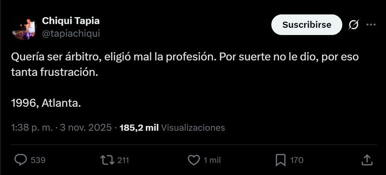 "Quería ser árbitro, eligió mal la profesión. Por suerte no le dio, por eso tanta frustración", escribió el presidente de la Asociación del Fútbol Argentino, sin aclarar a quién iba dirigido el dardo. Como única pista, al final del posteo dejó una fecha y una ciudad: "1996, Atlanta" (año y sede de los Juegos Olímpicos).