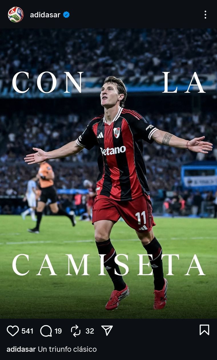 "Un triunfo clásico", escribió la marca de las tres tiras junto a una imagen de Facundo Colidio festejando el gol del 1-0 River y la frase "Con la camiseta", en clara alusión a la supremacía histórica del Millonario sobre Racing. El posteo fue leído como una chicana directa a Nike, que justamente tuvo su estreno como nueva indumentaria de la Academia en este partido.