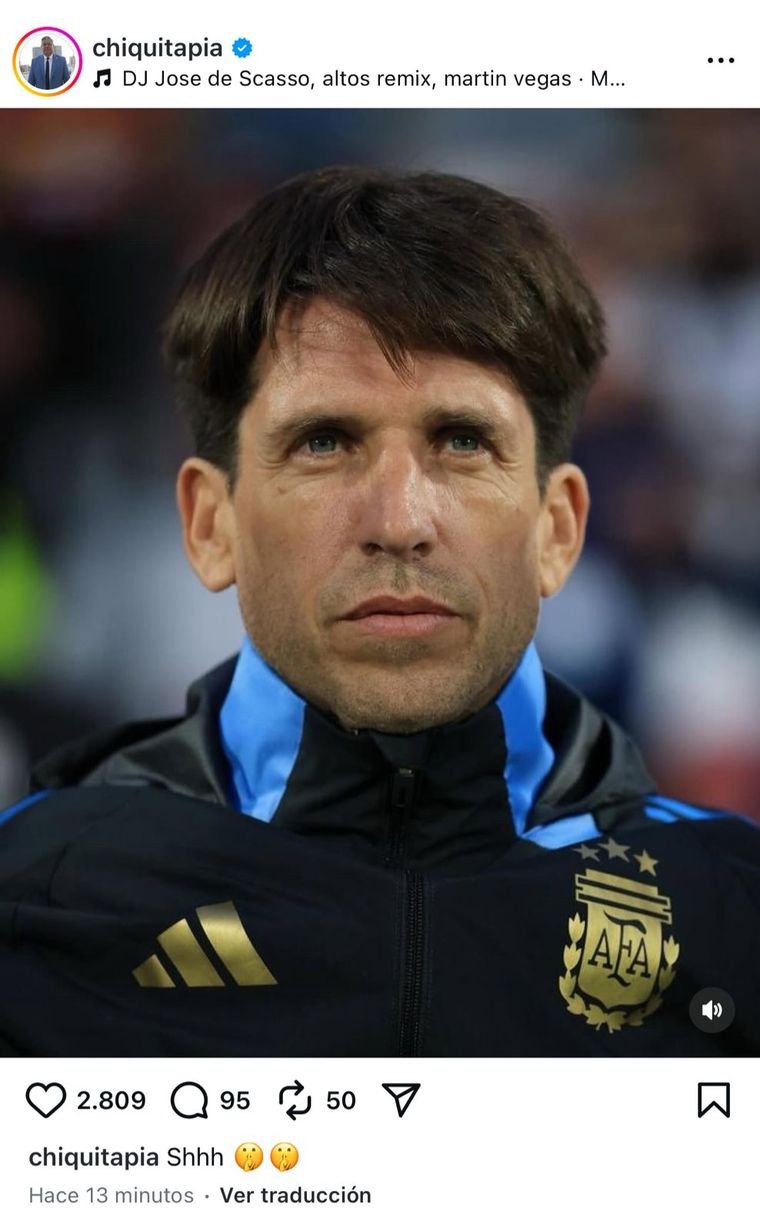 En su cuenta de Instagram, el presidente de la AFA subió una foto de Diego Placente, serio y concentrado, con la leyenda “Shhh ” y una elección musical que no fue casual: “Mamita ven (Sh shh nadie lo sabrá)”, el remix de DJ Jose de Scasso, Altos Remix y Martin Vegas, toda una ironía futbolera.