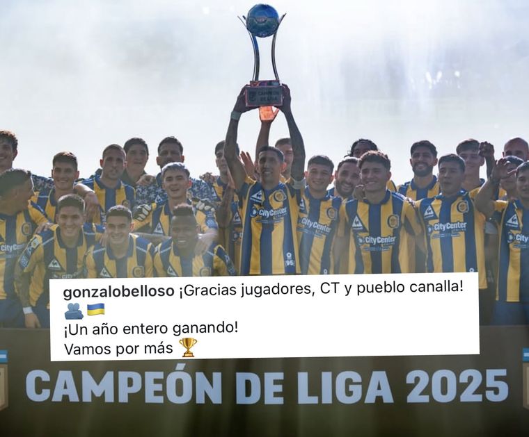 Más temprano, Belloso había publicado una foto del Fideo levantando el trofeo junto a un mensaje directo: “Gracias jugadores, CT y pueblo canalla! ¡Un año entero ganando! Vamos por más”. Después dedicó un párrafo especial al ídolo: "Gracias por volver y cumplir en salir campeón". Ángel respondió rápido: “Gracias presi. Vamos por más”.