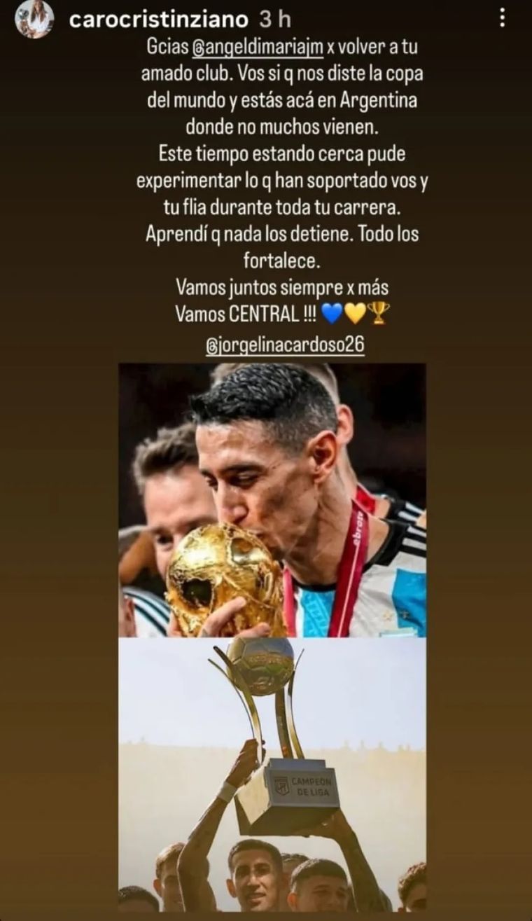 La dirigente completó el mensaje con un reconocimiento a lo vivido por el jugador y su entorno: “(En) Este tiempo estando cerca pude experimentar lo que han soportado vos y tu familia durante toda tu carrera. Aprendí que nada los detiene. Todo los fortalece. Vamos juntos siempre por más. ¡Vamos Central!”, arrobando tanto a Ángel como a su esposa Jorgelina Cardoso.