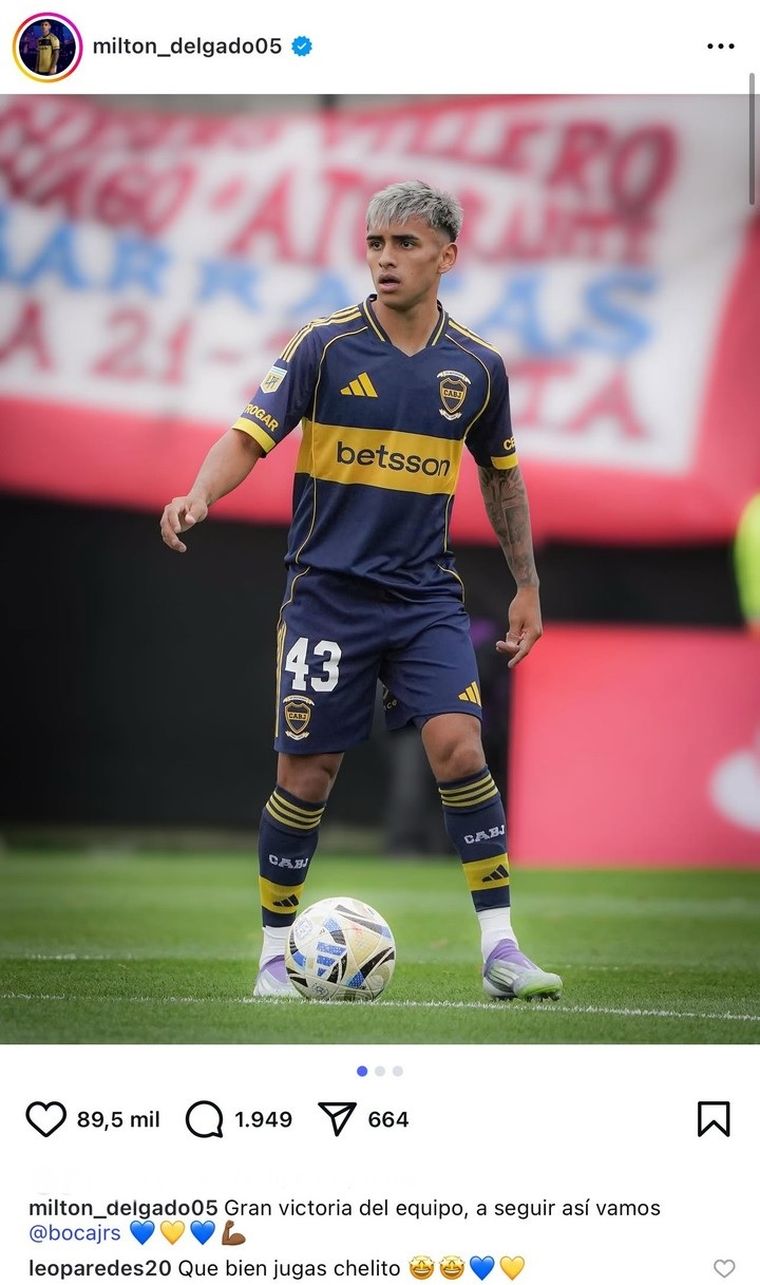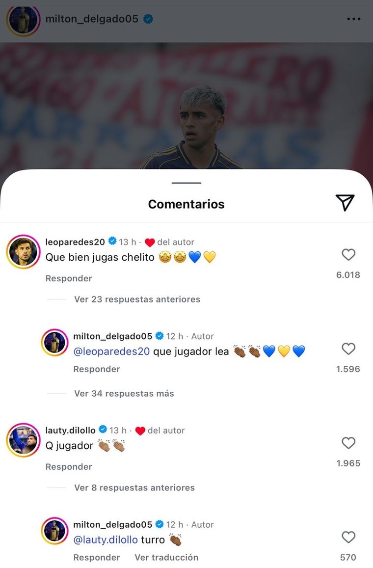 El posteo no tardó en llenarse de comentarios de compañeros y referentes del club, pero el más destacado fue el de Leandro Paredes: “Qué bien jugás, Chelito”, escribió el capitán. A lo que Delgado respondió: “Qué jugador, Lea”.