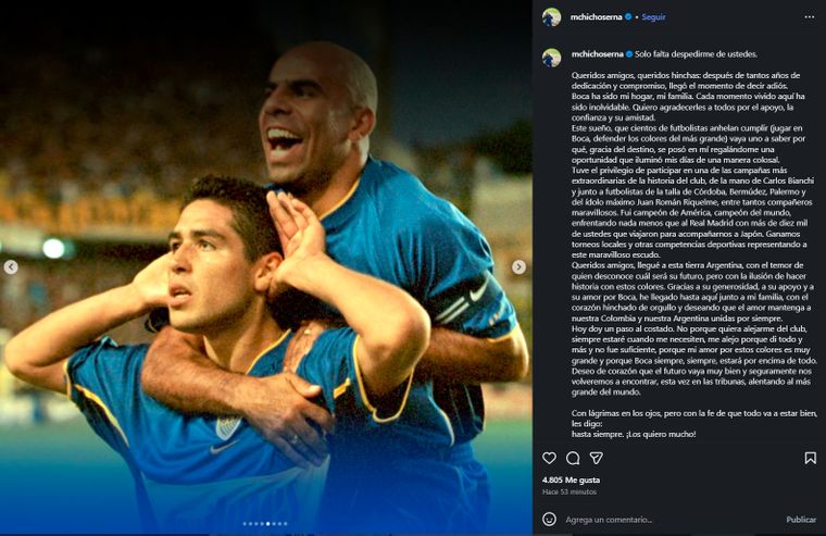El Chicho Serna se despidió de los hinchas de Boca en redes.
