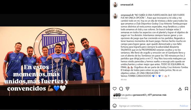 Omar Asad, DT de Godoy Cruz, fue el primer protagonista en expresarse tras el descenso. Lo hizo a través de las redes sociales.