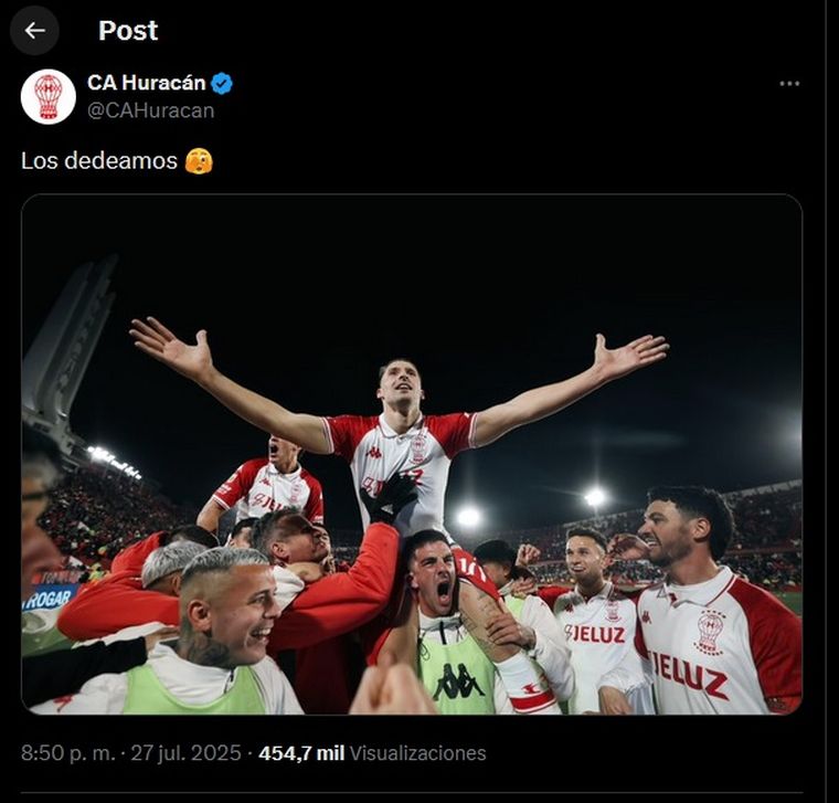 "Los dedeamos", fue el mensaje que publicó la cuenta oficial de Huracán junto a una foto del festejo del gol. El desubicado posteo fue parafraseando uno de los chats que se viralizaron en las últimas horas y que algunos usuarios, sin prueba alguna, asociaron al Chanchi Riquelme y una socia del club.