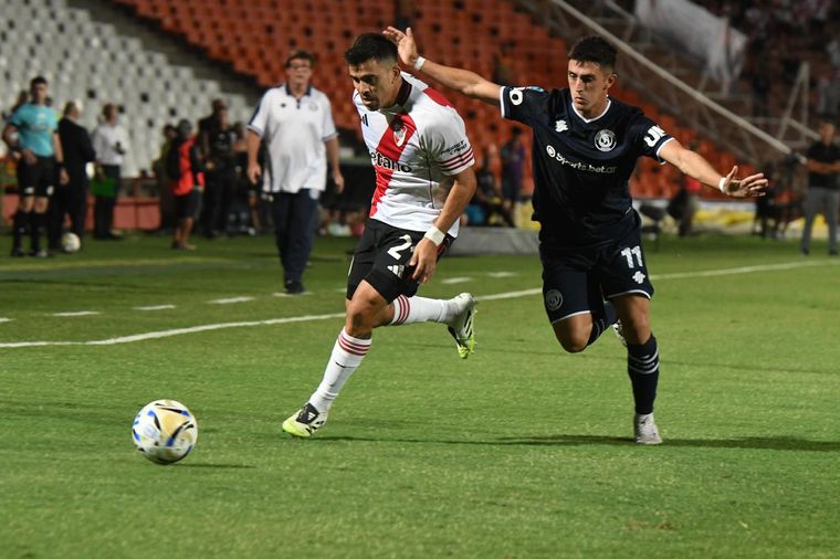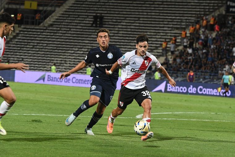 River, en esa primera mitad, no encontraba herramientas punzantes. Tenía la pelota por momentos, pero sin profundidad ni sorpresa. No generaba peligro real y parecía incómodo ante un equipo mendocino que lo presionaba y lo obligaba a equivocarse.
