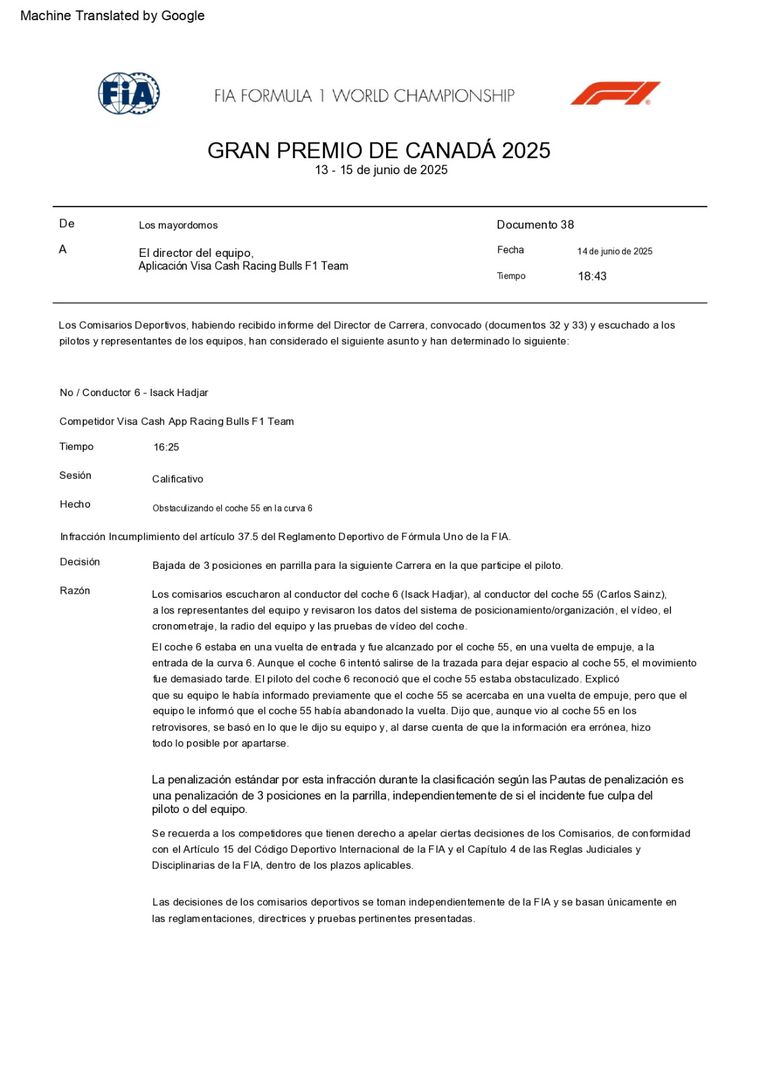 La noticia se confirmó este sábado por la tarde, cuando la FIA comunicó la sanción de tres posiciones para Isack Hadjar, piloto de Racing Bulls, por obstaculizar a Carlos Sainz en la curva 6 durante la Q1. El español se había quejado por radio y los comisarios le dieron la razón: Hadjar cayó del 9° al 12° puesto, justo detrás de Colapinto.