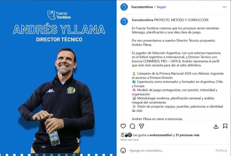 "En Fuerza Tombina creemos que los procesos serios necesitan liderazgo, planificación y una idea clara de juego. Por eso presentamos a nuestro Director Técnico propuesto: Andrés Yllana", destacaron en las redes oficiales.