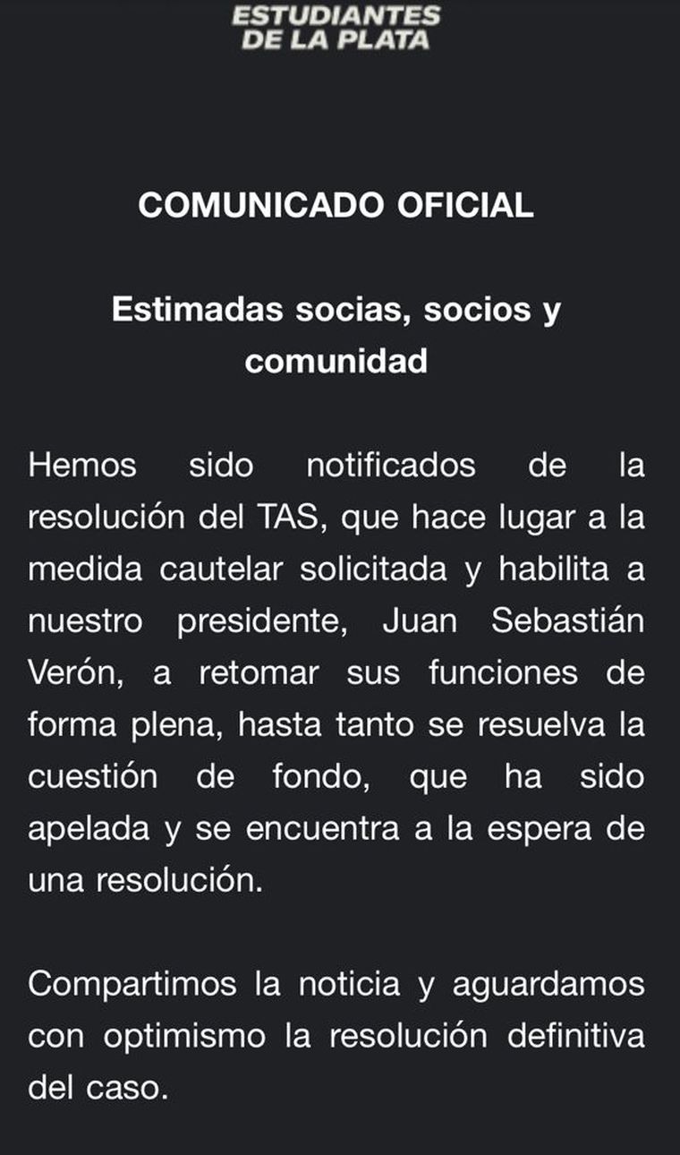 Así lo informó el club mediante un comunicado dirigido a las socias y socios del León: "Hemos sido notificados de la resolución del TAS, que hace lugar a la medida cautelar solicitada y habilita a nuestro presidente, Juan Sebastián Verón, a retomar sus funciones de forma plena, hasta tanto se resuelva la cuestión de fondo, que ha sido apelada y se encuentra a la espera de una resolución. Compartimos la noticia y aguardamos con optimismo la resolución definitiva del caso", reza el mismo.