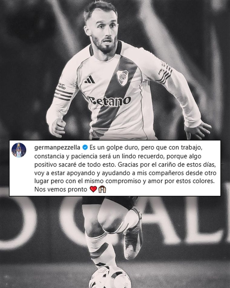 @RiverPlatePasaron apenas dos días desde aquella noche en Avellaneda en la que Germán Pezzella, con lágrimas en los ojos en el banco de suplentes, pareció intuir lo que vendría. Ahora, con el diagnóstico confirmado y algo más sereno, el defensor de River y campeón del mundo eligió hablarle a los hinchas.