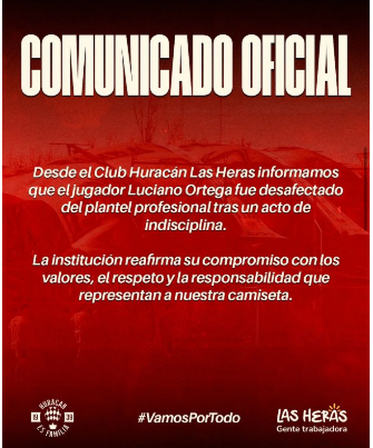 El mundo de Huracán Las Heras se vio sacudido en las últimas horas tras un comunicado oficial del club en el que se informa la desafectación del jugador Luciano Ortega del plantel profesional por un acto de indisciplina.
