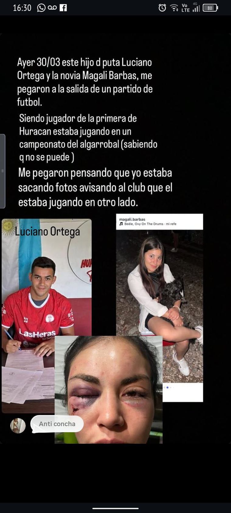 Según el testimonio difundido, una persona aseguró haber sido agredida por Ortega y su pareja, en un episodio que, de acuerdo a la versión publicada, estaría vinculado a la participación del jugador en un torneo no autorizado mientras formaba parte del plantel profesional.