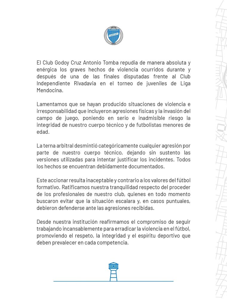 A través de un extenso comunicado, destacaron: "El Club Godoy Cruz Antonio Tomba repudia de manera absoluta y enérgica los graves hechos de violencia ocurridos durante y después de una de las finales disputadas frente al Club Independiente Rivadavia en el torneo de juveniles de Liga Mendocina. Lamentamos que se hayan producido situaciones de violencia e irresponsabilidad que incluyeron agresiones físicas y la invasión del campo de juego, poniendo en serio e inadmisible riesgo la integridad de nuestro cuerpo técnico y de futbolistas menores de edad".
